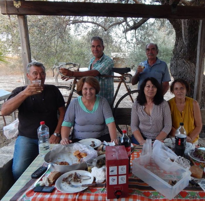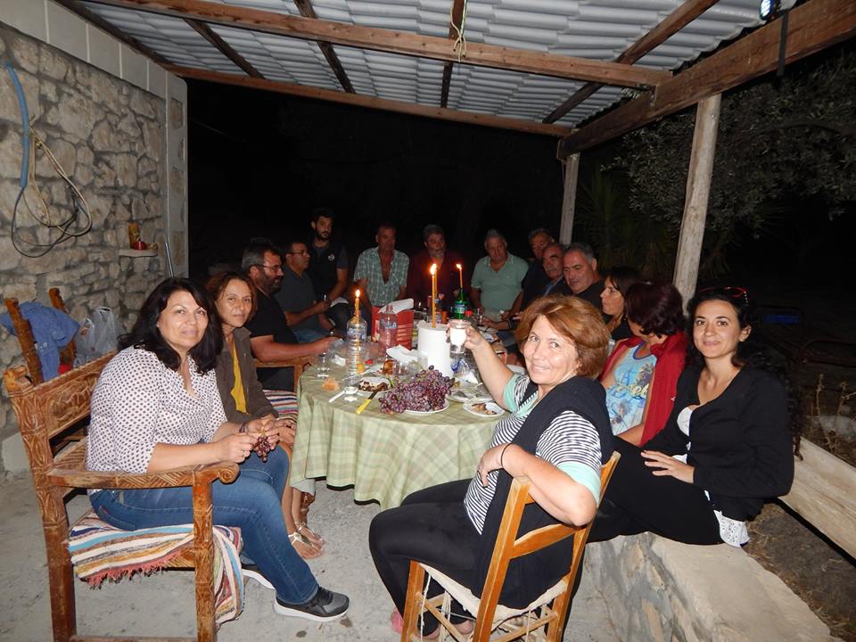 Ήτονε επίσης κάμποσοι χωριανοί και φίλοι, από τη Γαλιά και τσι Μοίρες!! ”Μάλλον κάποιο πουλάκι τους εσφύριξε και ήρθανε και μας σε βρήκανε”!! Εκρατούσανε κριάς, που το κάναμε βραστό, αλλά και στα κάρβουνα, καθώς επίσης και καλό κρασί!! Κρατούσανε όμως και πολλά ψημένα φαγιά, που απ’ αυτά ξεχώριζαν, οι χειρομυλόπιτες και τα ντολμαδάκια τση Κατερίνας του Παυλοζαχάρη, τα γαρδούμια τση Μαρίας του Παυλογιάννη, αλλά και το τηγανηστό κουνέλι τση Ιουλίας του Στεφανή, που με περίσσια τέχνη τό ‘χενε τοποθετημένο πάνω στα λεμονόφυλλα!! Στη συνέχεια μονοπαντήσαμε και αυτά που εγώ κρατούσα στη βούργια, ενώ φάγαμε καλά και ήπιαμε ούλο το κρασί και ευχόμαστε: