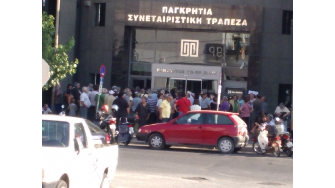 Η ουρά έξω από την Παγκρήτια τράπεζα στη λεωφόρο Ικάρου είχε σχηματιστεί από τις 6 το πρωί ενώ αντίστοιχη εικόνα παρατηρήθηκε έξω από όλα τα υποκαταστήματα που άνοιξαν για να μοιράσουν τα 120 ευρώ σε όσους δεν διέθεταν κάρτα αναλήψεων.