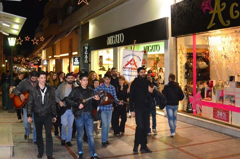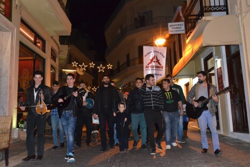 Η καντάδα ξεκίνησε από την πλ. Δασκαλογιάννη όπου ο Όμιλος από το μεσημέρι είχε συγκεντρωθεί για φαγητό, μουσική και χορό. Στη συνέχεια προχώρησε σε όλους τους κεντρικούς δρόμους της πόλης, πέρασε από την πλ. Λιονταριών και σε διάφορα σημεία κοντοστεκόταν για μια ρακή, ένα κέρασμα ή ένα χορό με όλους τους παρευρισκόμενους. Η όμορφη αυτή παρέα κατέληξε στην πλ. Ελευθερίας, πέρασε από όλα τα όμορφα παραδοσιακά σπιτάκια των εορτών και κατέληξε στο Στέκι του ΑΕΤΟΓΙΑΝΝΗ, όπου στήθηκε άλλο ένα γνήσιο κρητικό γλέντι με απλότητα και αυθορμητισμό, συμμετοχή από όλο τον κόσμο και ζεστασιά στις καρδιές και στην φιλοξενία που ξεπερνούσε το υπερβολικό ψύχος των ημερών και την αποξένωση της εποχής.
