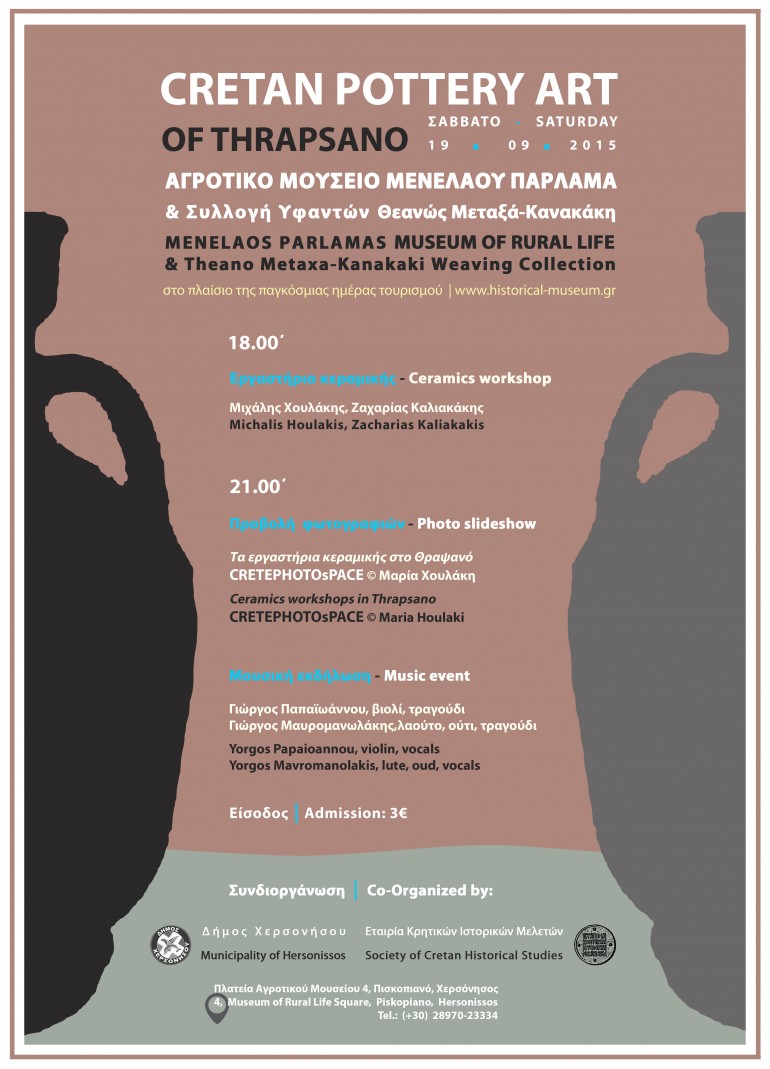 Για δεύτερη συνεχόμενη χρονιά, η Εταιρία Κρητικών Ιστορικών Μελετών σε συνεργασία με το Δήμο Χερσονήσου τιμά την τέχνη της κεραμικής της Κρήτης, στο Αγροτικό Μουσείο Μενελάου Παρλαμά & Συλλογή Υφαντών Θεανώς Μεταξά Κανακάκη, στις 19 Σεπτεμβρίου, από τις 18.00΄ έως τις 23.00΄.