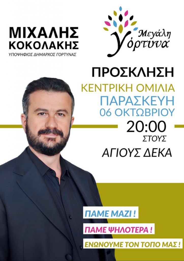 Η κεντρική ομιλία του υποψηφίου Δημάρχου Γόρτυνας, Μιχάλη Κοκολάκη, θα πραγματοποιηθεί την Παρασκευή 6 Οκτωβρίου, ώρα 20:00 στους Αγίους Δέκα.