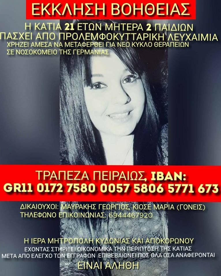 Ήδη η ανταπόκριση στην έκκληση προκειμένου η 21χρονη μητέρα Κάτια Μαυράκη – Μαυρακάκη να μπορέσει να υποβληθεί σε θεραπεία της οξείας λευχαιμίας από την οποία πάσχει, είναι σημαντική.