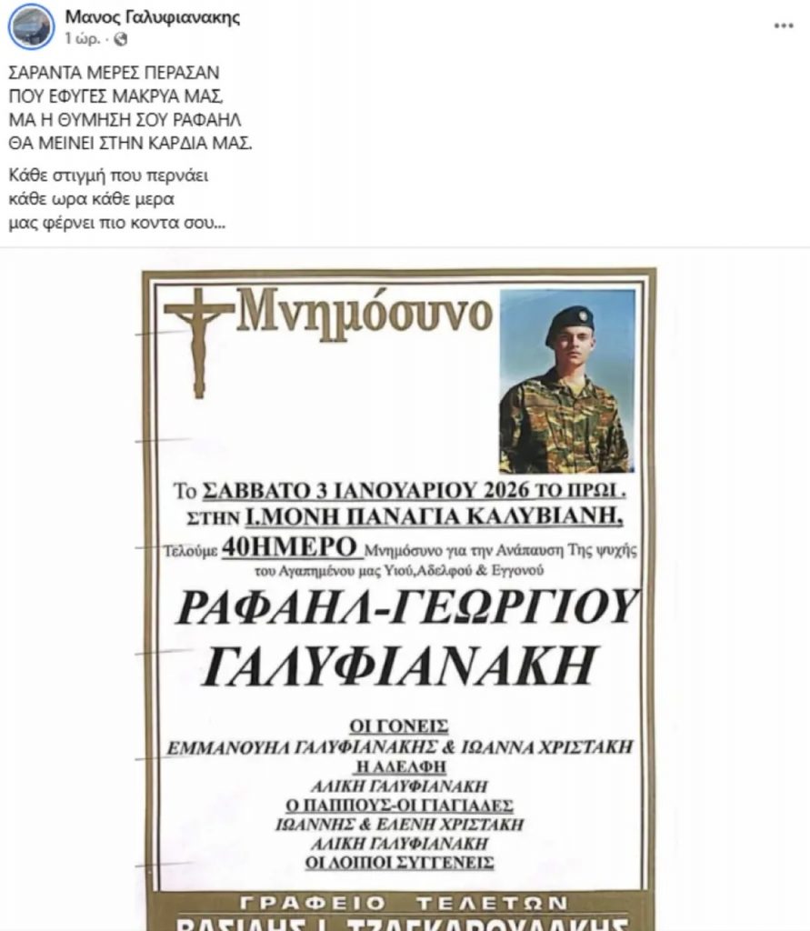 «Κάθε στιγμή που περνάει, κάθε ώρα, κάθε μέρα μας φέρνει πιο κοντά σου», γράφει ο Μάνος Γαλυφιανάκης στο Facebook. Στην ανάρτησή του, έγραψε και μία μαντινάδα: «Σαράντα μέρες πέρασαν που έφυγες μακριά μας, μα η θύμησή σου Ραφαήλ θα μείνει στην καρδιά μας».