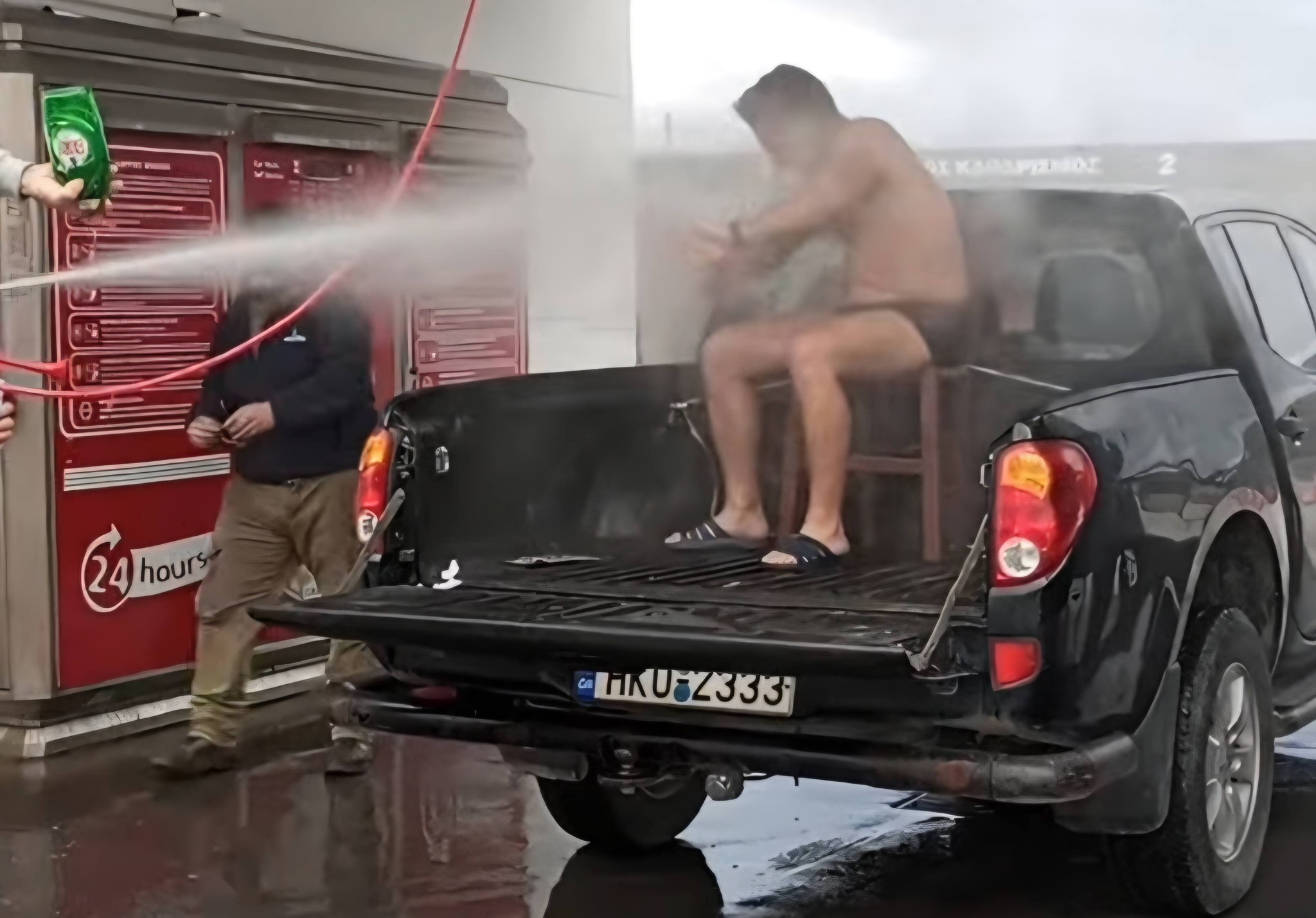 Ο γαμπρός Αντώνης -που παντρεύεται, απόψε, ανήμερα της ονομαστικής του εορτής, στο χωριό Λούρες Δήμου Γόρτυνας- “φορτώθηκε” στην καρότσα αγροτικού και οδηγήθηκε σε Πλυντήριο Αυτοκινήτων, όπου οι φίλοι του τού έκαναν “γενικό καθαρισμό”, πλένοντας τον με νερό υπό πίεση, με τη μάνικα, πριν φορέσει το γαμπριάτικο κουστούμι!