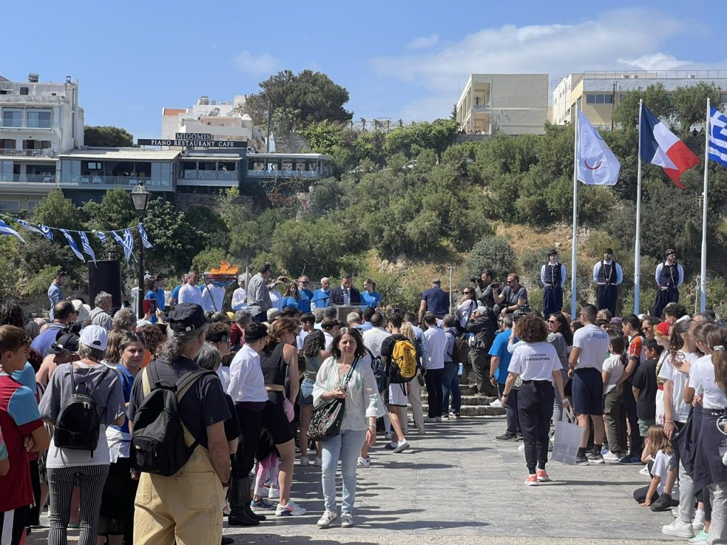 Ακολούθησε η Αφή της Ολυμπιακής Φλόγας στον βωμό, η ανάκρουση του Εθνικού Ύμνου από την Μικτή Χορωδία, ομιλίες από το Δήμαρχο Αγίου Νικολάου κ. Μανώλη Μενεγάκη και τους εκπρόσωπους της γαλλικής και της ελληνικής Ολυμπιακής Επιτροπής.