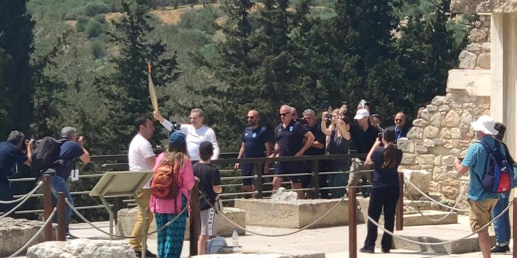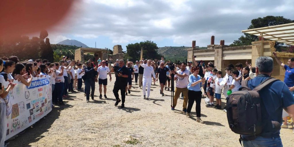 Λίγο πριν τη 1.00 το μεσημέρι, η Ολυμπιακή Φλόγα έφτασε στον αρχαιολογικό χώρο της Κνωσού για να ακολουθήσει λαμπαδηδρομία με κατάληξη την πλατεία Αγίου Τίτου, στο κέντρο του Ηρακλείου.