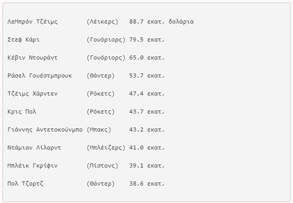 Ο ΛεΜπρον Τζέιμς παραμένει ο παίκτης με τις υψηλότερες αποδοχές, από μισθούς-χορηγούς, στο ΝΒΑ, ενώ ο Γιάννης Αντετοκούνμπο, βρίσκεται ανάμεσα στους δέκα πρώτους της νέας σχετικής λίστας που παρουσίασε το Forbes, καταλαμβάνοντας τη έκτη θέση, ανεβαίνοντας μια θέση, σε σχέση με την προηγούμενη καταγραφή του αμερικανικού οικονομικού περιοδικού.
