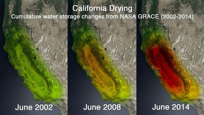 Στις 17 Ιανουαρίου, οι επιστήμονες συγκέντρωσαν νέα δεδομένα από τον δορυφόρο Grace της NASA, μένοντας έκπληκτοι -αν όχι τρομοκρατημένοι- από τα στοιχεία. Η Καλιφόρνια των Ηνωμένων Πολιτειών είναι στα όρια επικής ξηρασίας, με τα αποθέματα νερού να λιγοστεύουν δραματικά. Την ημέρα της δημοσίευσης των στοιχείων, ο κυβερνήτης της Πολιτείας κήρυξε την Καλιφόρνια σε κατάσταση εκτάκτου ανάγκης και ζήτησε από τους κατοίκους της, να περιορίσουν την κατανάλωση νερού κατά 20%.