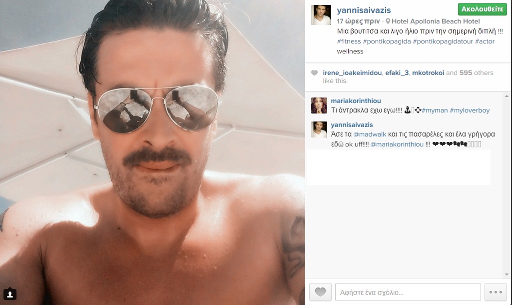 Ενώ με χιουμοριστική διάθεση απαντάει στο σχόλιο της συζήγου του,Μαρίας Κορινθίου,καλώντας τη να αφήσει τις πασαρέλες και να έρθει κοντά του.
