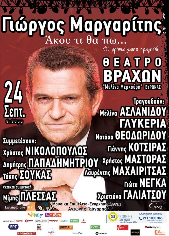 Το βράδυ της Δευτέρας, 24 Σεπτεμβρίου σε μια μεγάλη συναυλία και με την παρουσία μεγάλων ονομάτων του ελληνικού τραγουδιού ο Γιώργος Μαργαρίτης γιορτάζει σαράντα χρόνια στο τραγούδι. Στο Θέατρο Βράχων “Μελίνα Μερκούρη”.