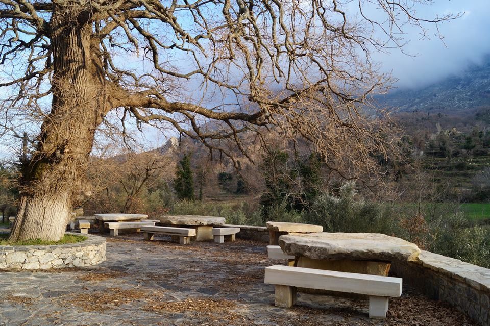 Ο γύρω χώρος δίπλα στον ασφάλτινο δρόμο , έχει διαμορφωθεί σε παρκάκι με μεγάλα πέτρινα τραπέζια, ιδανικά για πικ νικ.