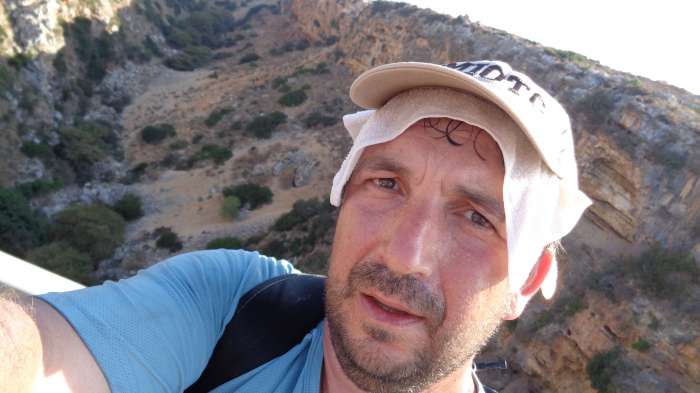 -Την δεύτερη μέρα με ξύπνησε ο αέρας εκεί, το κύμα και ξεκίνησα λίγο πιο μπροστά στις 6.05 π.μ και το τέλος της διαδρομής ήταν στο Γάζι Ηρακλείου, δεν θυμάμαι ακριβώς πως λέγεται εκεί, σε μια στάση που έχει το ΚΤΕΛ . Εκεί λοιπόν στην είσοδο του Ηρακλείου σταμάτησα την διαδρομή μου. Στον δρόμο κανένας δε με σταμάτησε ή με ρώτησε τι κάνω και περπατάω. Γενικά η περιβολή μου έμοιαζε και με τουρίστα, ήμουν αξύριστος και ταλαιπωρημένος, και δεν με ρώτησε κάποιος αλλά και εγώ δεν ήθελα να δώσω στόχο. Από τρόφιμα δεν κουβαλούσα τίποτα. Ένα σάντουιτς πήρα εκεί στη μεγάλη ευθεία, στου “Κακλή” και βούτηξα λίγο στην θάλασσα γιατί δεν άντεχα άλλο, είχε τελειώσει και το νερό. Μετά συνέχισα και έφαγα στη Σκαλέτα σε ένα κέντρο του Παρασύρη όπου και κοιμήθηκα μετά την πρώτη μέρα στις ξαπλώστρες. Στης Σίσσες μια καλή κυρία μου έδωσε ένα μπουκάλι νερό, δεν ήθελε και λεφτά ..”.