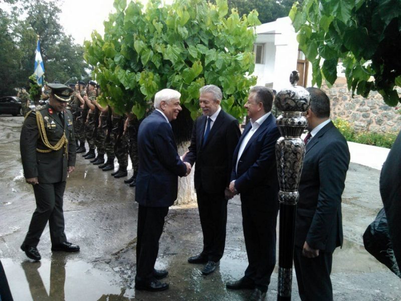 Στην τιμητική τελετή που ακολούθησε στο χώρο του Άλσους, τον κ. Παυλόπουλο υποδέχθηκε στο νησί και το Οροπέδιο Λασιθίου ο Περιφερειάρχης Κρήτης Σταύρος Αρναουτάκης, τονίζοντας πως ο Μάιος είναι ο μήνας που διαδραματίστηκαν γεγονότα που σημάδεψαν την ιστορία του τόπου.