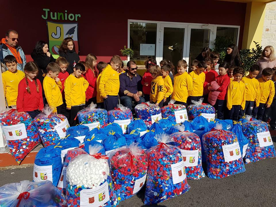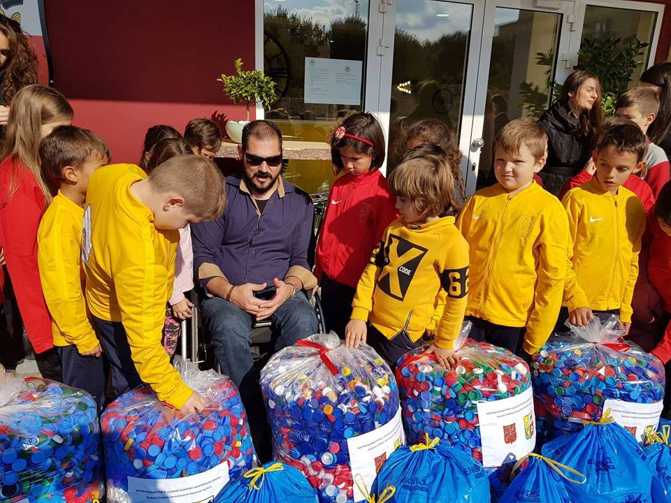 Στη συνάντηση αυτή, συνομίλησε με τα παιδιά για τις καθημερινές δυσκολίες που αντιμετωπίζουν τα άτομα με αναπηρία και παρέλαβε 220 κιλά πλαστικά καπάκια, τα οποία είχαν συλλέξει τα παιδιά μαζί με τους γονείς τους.