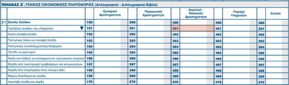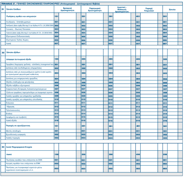 3) Πίνακας Ζ (Η συμπλήρωση του σχετικού πίνακα Ζ’ είναι υποχρεωτική και για τις επιχειρήσεις που τηρούν απλογραφικά βιβλία, οι οποίες θα καταχωρούν τα δεδομένα των βιβλίων τους με βάση την προτεινόμενη περιγραφή των λογαριασμών που περιγράφονται στον πίνακα αυτό.)