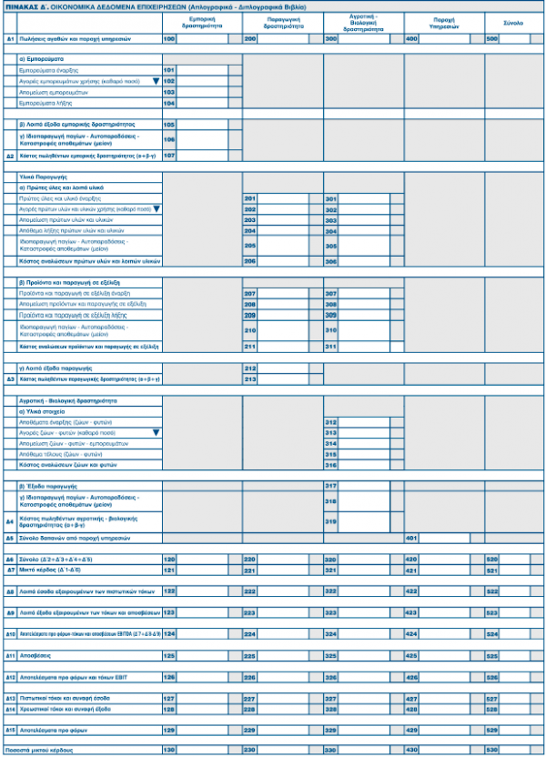 5) Πίνακας Δ (Δ1,Δ2,Δ3,Δ4,Δ5,Δ6,Δ7 και Δ8 έως Δ15) (Η συμπλήρωση του Πίνακα Δ10 για τις επιχειρήσεις, οι οποίες έχουν ενσωματώσει στις λοιπές δαπάνες του κόστους παραγωγής τις αποσβέσεις, δεν προκύπτει με βάση το αποτέλεσμα της πράξης (Δ7+Δ8-Δ9) όπως αναγράφεται στην σχετική ένδειξη.