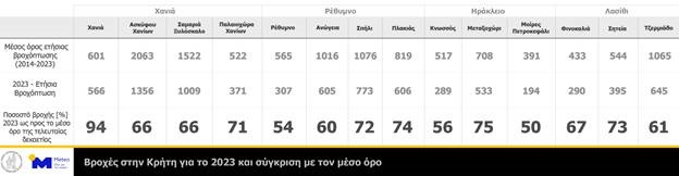 Σε όλες περιοχές οι βροχές του 2023 ήταν πολύ περιορισμένες σχέση με το μέσο όρο της τελευταίας δεκαετίας (2014-2023), με ποσοστά που κυμάνθηκαν από 50 ως 75% του μέσου όρου.