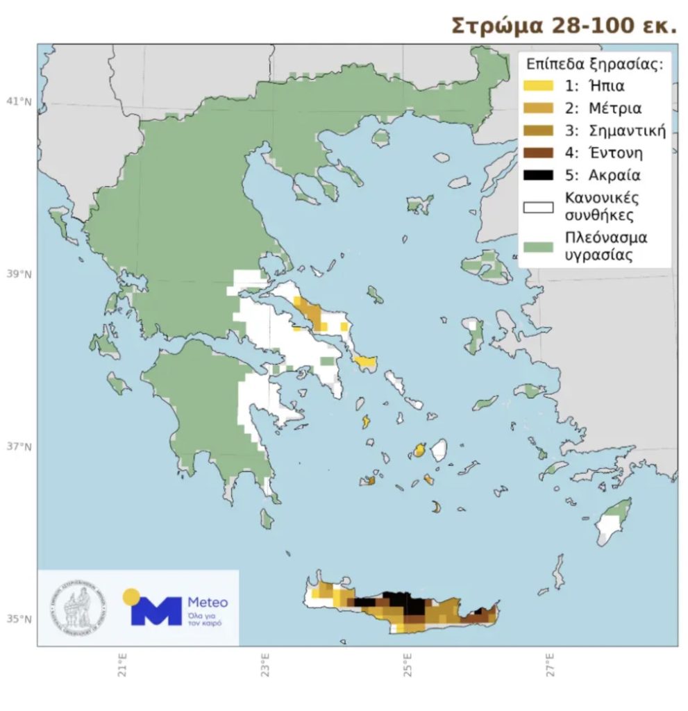 Ταυτόχρονα, αύξηση παρουσίασε η σχετική υγρασία εδάφους και στο βαθύτερο στρώμα υπεδάφους (28-100 εκατοστά) στα ανατολικά ηπειρωτικά καθώς επίσης και στη δυτική Κρήτη όπου παρατηρήθηκε μερική υποχώρηση των επιπέδων ξηρασίας. Στα δεδομένα για το βαθύτερο στρώμα, διαπιστώνεται πως το μεγαλύτερο μέρος της ηπειρωτικής χώρας παραμένει σε συνθήκες πλεονάσματος υγρασίας, ενώ κοντά στον μέσο όρο για την εποχή βρίσκεται η ανατολική Στερεά Ελλάδα και περιοχές της ανατολικής Πελοποννήσου. Όμως σε σχετική ξηρασία παραμένει μεγάλο μέρος της Κρήτης.
