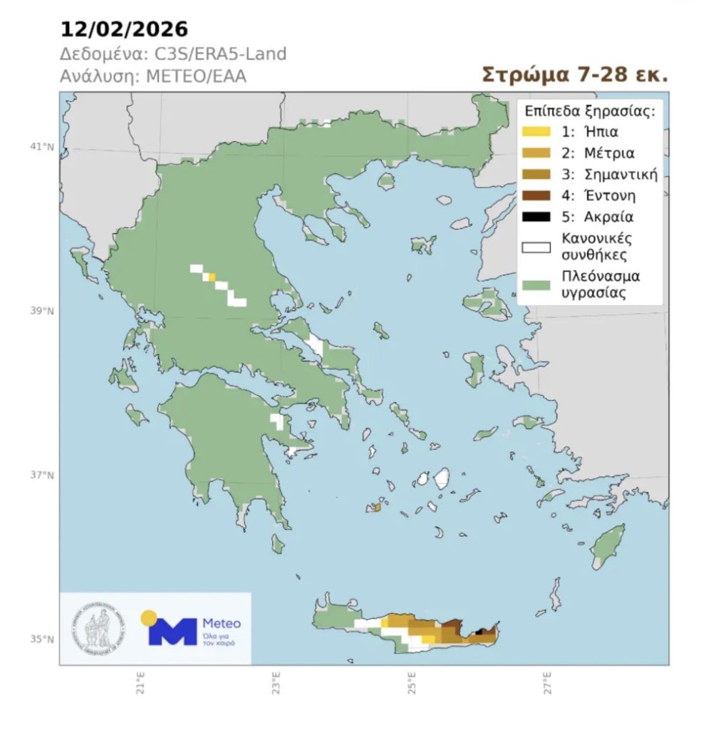 Η ανάλυση του Αστεροσκοπείου αφορά τις συνθήκες ξηρασίας στη χώρα στις 12 Φεβρουαρίου και βασίζεται στην απόκλιση της υγρασίας των στρωμάτων υπεδάφους από τα κανονικά για την εποχή επίπεδα στο επιφανειακό στρώμα και το βαθύτερο.