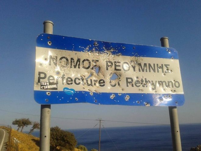 Γαζωμένες με σφαίρες, με μαντινάδες, με έξυπνα μηνύματα, πινακίδες κρυμμένες στα πιο απίθανα μέρη, πινακίδες για όλα τα γούστα με έμπνευση απολύτως Κρητική.