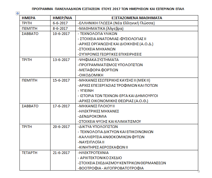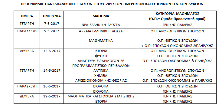 «Καθορίζουμε το πρόγραμμα διεξαγωγής των πανελλαδικών εξετάσεων των μαθημάτων της Γ’ τάξης ημερήσιων και της Δ’ τάξης εσπερινών Γενικών Λυκείων έτους 2017, ως ακολούθως» αναφέρει σε ανακοίνωσή του το υπουργείο και παραβάλει πίνακες με τις ημερομηνίες εξέτασης.