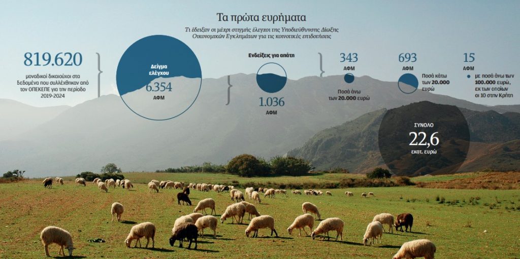 Βάσει των στοιχείων που παρουσίασε από τη Θεσσαλονίκη ο υπουργός Προστασίας του Πολίτη Μιχάλης Χρυσοχοΐδης, εντοπίστηκαν ισχυρές ενδείξεις απάτης σε 1.036 ΑΦΜ (από δείγμα ελέγχου 6.354 ΑΦΜ), με το συνολικό ποσό των επιδοτήσεων που φέρεται να εισπράχθηκαν παρανόμως να ανέρχεται σε 22,6 εκατ. ευρώ. Τα πρωτεία, βάσει αυτών των αρχικών ευρημάτων, φαίνεται πως κατέχει η Κρήτη, όπου αντιστοιχούν 850 ΑΦΜ και 17,2 εκατ. ευρώ.
