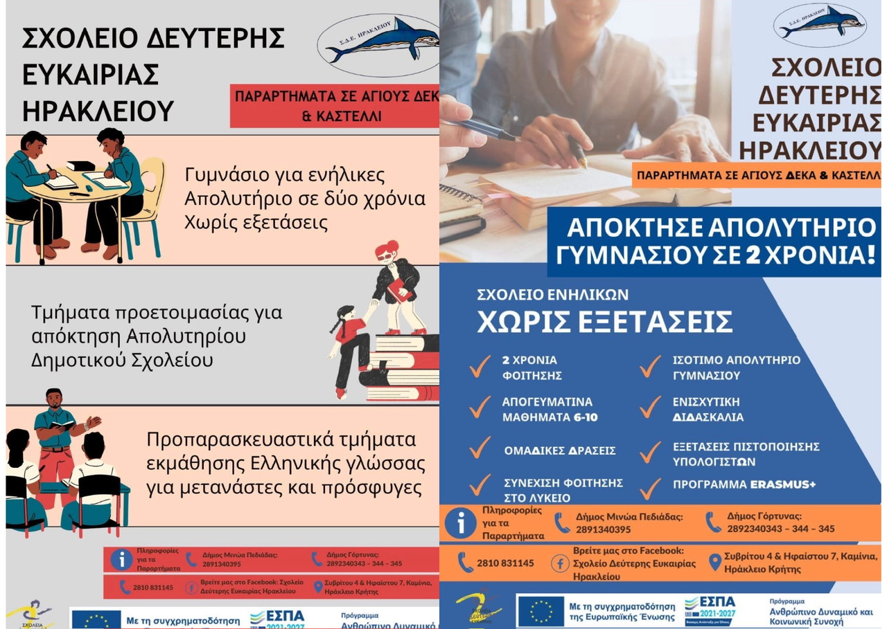 Την Δευτέρα 15 Σεπτεμβρίου 2025, ώρα 20:00, στο Δημαρχείο Γόρτυνας, στους Αγίους Δέκα, θα πραγματοποιηθεί ενημερωτική εκδήλωση σχετικά με την λειτουργία του Σχολείου Δεύτερης Ευκαιρίας στον Δήμο μας.
