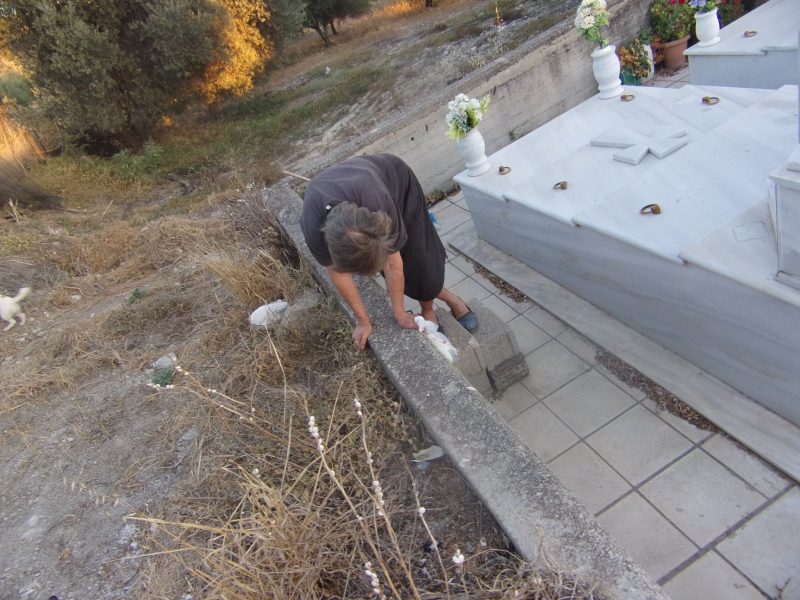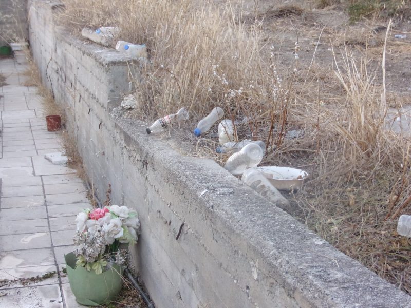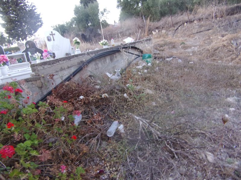 Να φανταστούμε τώρα ένα νεκροταφείο σκέτο σκουπιδαριό στον περιβάλλοντα χώρο, χωρίς ένα μικρό κάδο και στο πίσω του μέρος του? Ένα περιτοίχειο αρκετά υψηλό, χωρίς σκαλιά, που αυτό θα πρέπει η κάθε 85ρα γριά γυναίκα, να το καβαλήσει, με τα τρεμάμενα της πόδια, για να κατέβει σώα και αβλαβή, να πάει να «συνομιλήσει» με το ταίρι της, και να προσευχηθεί στο Πανάγαθο Θεό, για ανάπαυση της ψυχής Του…