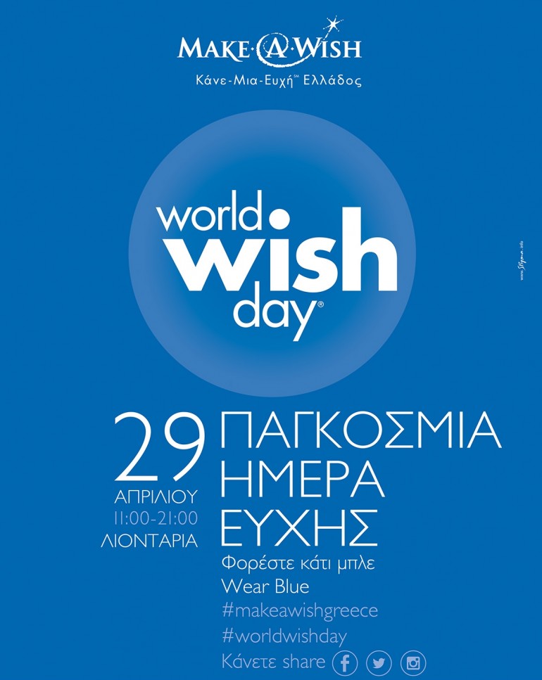 29 Απριλίου…όλη η Ελλάδα ντύνεται στα Μπλε-Wear Blue&Share, κοινοποιώντας τη φωτογραφία σας στα μέσα κοινωνικής δικτύωσης όπως το Facebook, το Twitter και στο Instagram με #makeawishgreece και #worldwishday.