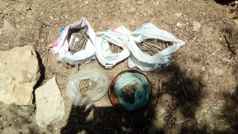 Βρέθηκαν και κατασχέθηκαν 8 χειροβομβίδες, 3 γεμιστήρες, 499 φυσίγγια 24 πυροκροτητές, 120 βολίδες, 22 μέτρα βραδύκαυστο φυτίλι, 936 κάλυκες, εξάρτημα μπιστολιού και ξιφολόγχη