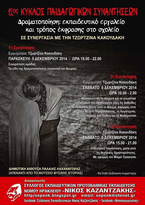 Σεμινάριο θεατρικής αγωγής με στόχο την εξοικείωση των δασκάλων θεάτρου (νηπιαγωγών, δασκάλων, καθηγητών, θεατρολόγων, εμψυχωτών, ηθοποιών) με τις θεωρίες, τις μεθόδους και τις πρακτικές της «θεατρικής παιδείας» στις διάφορες βαθμίδες εκπαίδευσης διοργανώνει ο σύλλογος εκπαιδευτικών πρωτοβάθμιας εκπαίδευσης νομού Ηρακλείου “Νίκος Καζαντζάκης”.