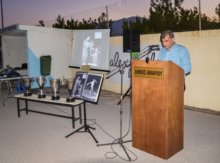 Ο Δήμαρχος Αμαρίου κ. Παντελής Μουρτζανός στο σύντομο χαιρετισμό του τόνισε ότι έχουμε χρέος να τιμούμε ανθρώπους που πρόσφεραν στον τόπο μας και έκαναν γνωστό το Αμάρι και ευχαρίστησε την οικογένεια του για την προσφορά των τιμητικών κυπέλλων και διπλωμάτων καθώς και φωτογραφικού υλικού του Μιχάλη Μαράκη .