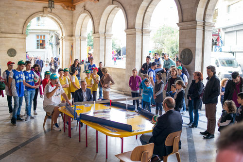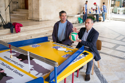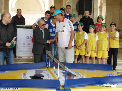 Στο κέντρο του αίθριου της Λότζια υπήρχε στημένο (βλ. φωτο) ένα κίτρινο τραπέζι T – ball και σε εμφανές σημείο φαινόταν ότι η καρδιά της Κρήτης στις 30/11/2014 χτυπούσε στο Ηράκλειο με αυτό το καταπληκτικό παιχνίδι όπου όλοι μικροί και μεγάλοι θέλησαν να πάρουν μια γεύση παίζοντας με τα μάτια κλειστά και όχι μόνο.