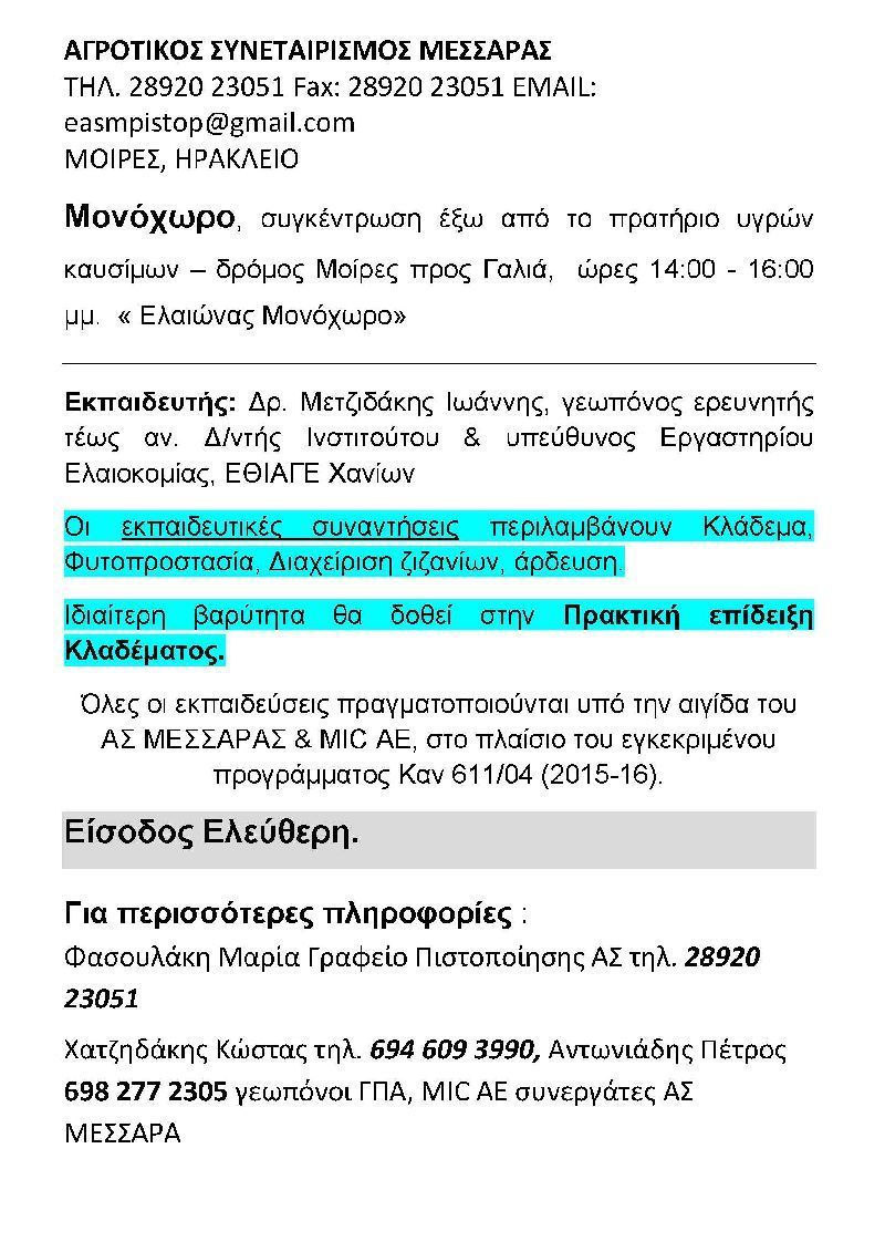 Συνεχίζονται από τον Αγροτικό Συνεταιρισμό Μεσαράς και την MIC A.E. οι εκπαιδευτικές συναντήσεις με τους ενδιαφερόμενους παραγωγούς καλλιέργειας ελιάς.