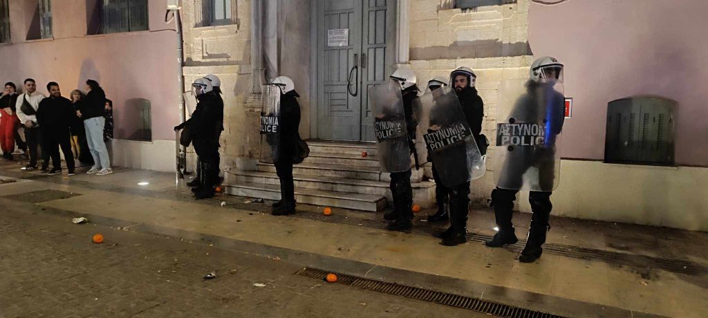 Έξω από δικαστικό μέγαρο υπάρχουν δυνάμεις των ΜΑΤ, εναντίον των οποίων κάποιοι παρευρισκόμενοι πέταξαν αυγά, νεράντζια και μπουκάλια.