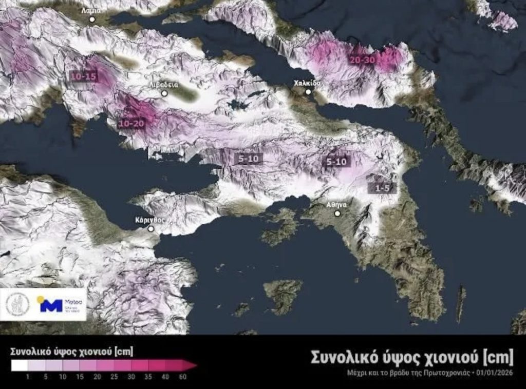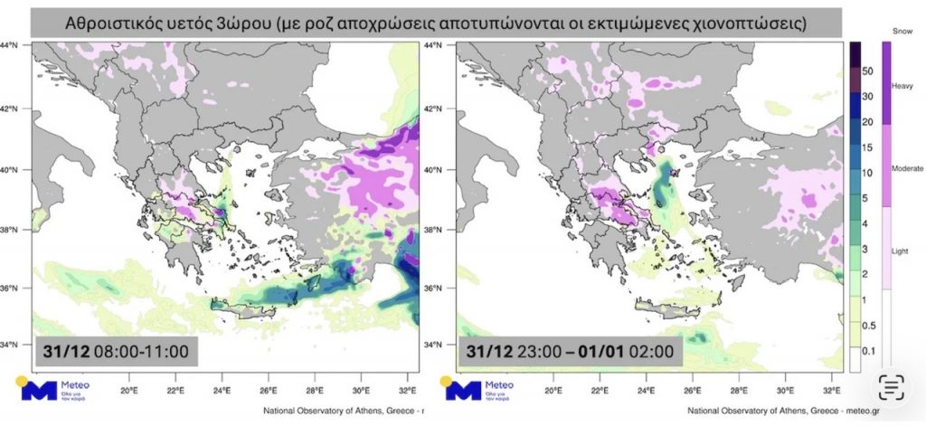 Στους χάρτες που δημοσίευσε το meteo.gr, παρουσιάζεται ο αθροιστικός υετός 3ώρου για τις 08:00-11:00 της Τετάρτης 31/12 και 23:00 της Τετάρτης 31/12 – 02:00 της Πέμπτης 01/01/2026, καθώς και η εκτιμώμενη αθροιστική χιονόστρωση στην Ανατολική Στερεά και στην Αττική έως και το βράδυ της Πέμπτης 01/01/2026.