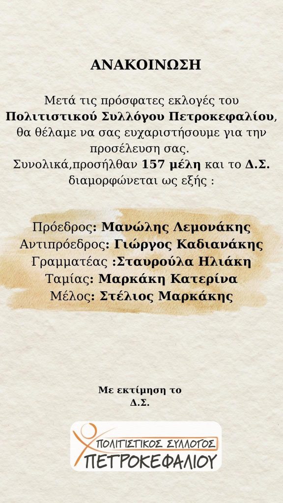 Σας ευχαριστούμε από καρδιάς», αναφέρει η ανακοίνωση του Πολιτιστικού Συλλόγου Πετροκεφαλίου.