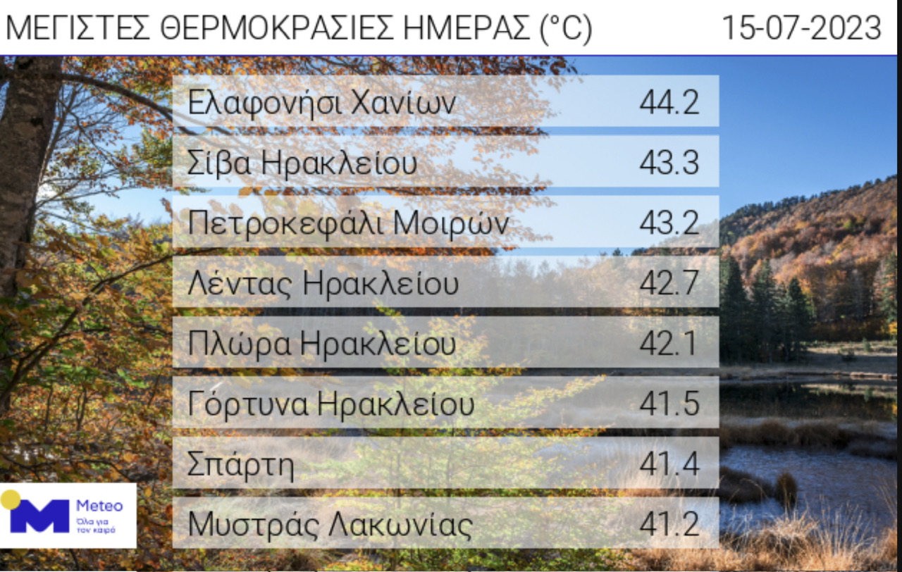 Στο Ελαφονήσι σύμφωνα με το meteo το θερμόμετρο έδειξε 44,2 βαθμούς Κελσίου, ενώ στο Σίβα και στο Πετροκεφάλι του δήμου Φαιστού το θερμόμετρο έφτασε στους 43,3 και 43,2 βαθμούς Κελσίου.