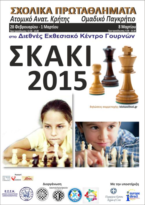 Η Σκακιστική Ακαδημία Χερσονήσου και η Κοινωφελής Επιχείρηση Δήμου Χερσονήσου διοργανώνουν, σε συνεργασία με τον Σκακιστικό Όμιλο Ηρακλείου και τον ΟΑΑ Ηρακλείου και με την υποστήριξη της Περιφέρειας Κρήτης και του Europe Direct, δύο εξαιρετικά σημαντικές διοργανώσεις παγκρήτιας εμβέλειας: τα ΣΧΟΛΙΚΑ ΣΚΑΚΙΣΤΙΚΑ ΠΡΩΤΑΘΛΗΜΑΤΑ.