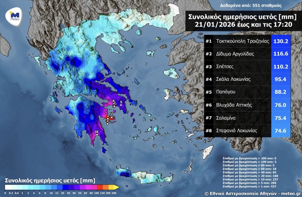 Στο μεταξύ σύμφωνα με στοιχεία από το δίκτυο αυτομάτων μετεωρολογικών σταθμών του Εθνικού Αστεροσκοπείου Αθηνών/meteo.gr μέχρι τις 17:20 τα μεγαλύτερα ύψη βροχής καταγράφηκαν στην Τακτικούπολη Τροιζηνίας (130.2 mm), στα Δίδυμα Αργολίδας (116.6 mm), στις Σπέτσες (110.2 mm), σε Σκάλα και Στεφανιά Λακωνίας (95.4 και 74.6 mm αντίστοιχα) καθώς και σε περιοχές της Αττικής και συγκεκριμένα σε Παπάγου (88.2 mm), Βλυχάδα Αττικής (76 mm) και Σαλαμίνα (75.4 mm).