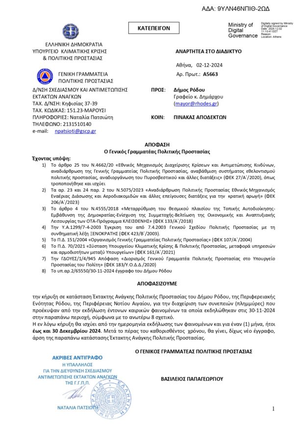 Ειδικότερα για τη Ρόδο, έπειτα από αίτημα του Δημάρχου, Αλέξανδρου Κολιάδη, ο Δήμος Ρόδουκηρύχθηκε και επισήμως σε κατάσταση έκτακτης ανάγκης, με απόφαση του Γενικού Γραμματέα Πολιτικής Προστασίας Βασίλειου Παπαγεωργίου.