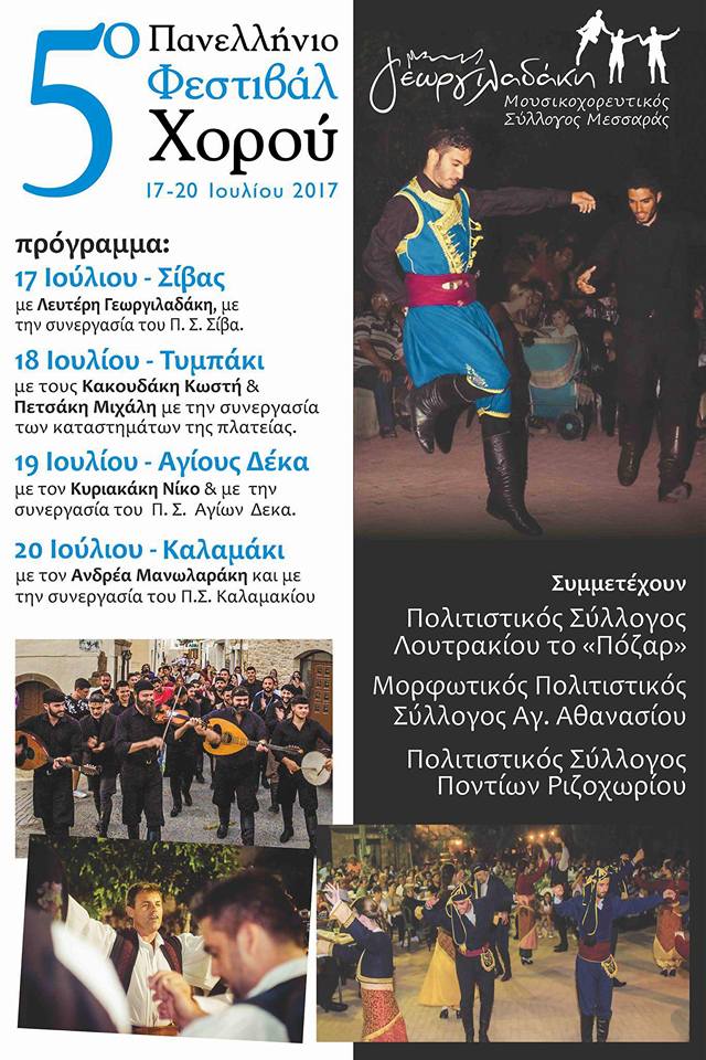 18-7-17 στη πλατεία Τυμπακίου παρουσίαση χορευτικών συγκροτημάτων. Ακολουθεί κρητικό γλέντι με τον Κακουδάκη Κωστή – Μιχάλη Πετσάκη.
