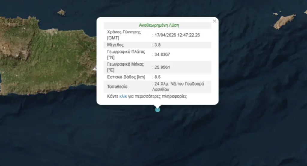 Το επίκεντρο του σεισμού εντοπίζεται στα 24 χιλιόμετρα νοτιοδυτικά του Γουδουρά Λασιθίου.