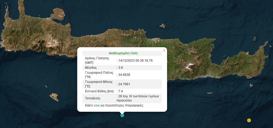 Σεισμική δόνηση εντάσεως 3,9 βαθμών της κλίμακας Ρίχτερ σημειώθηκε στις 07:36 το πρωί της Πέμπτης, στη θαλάσσια περιοχή Καλοί Λιμένες του νομού Ηρακλείου.