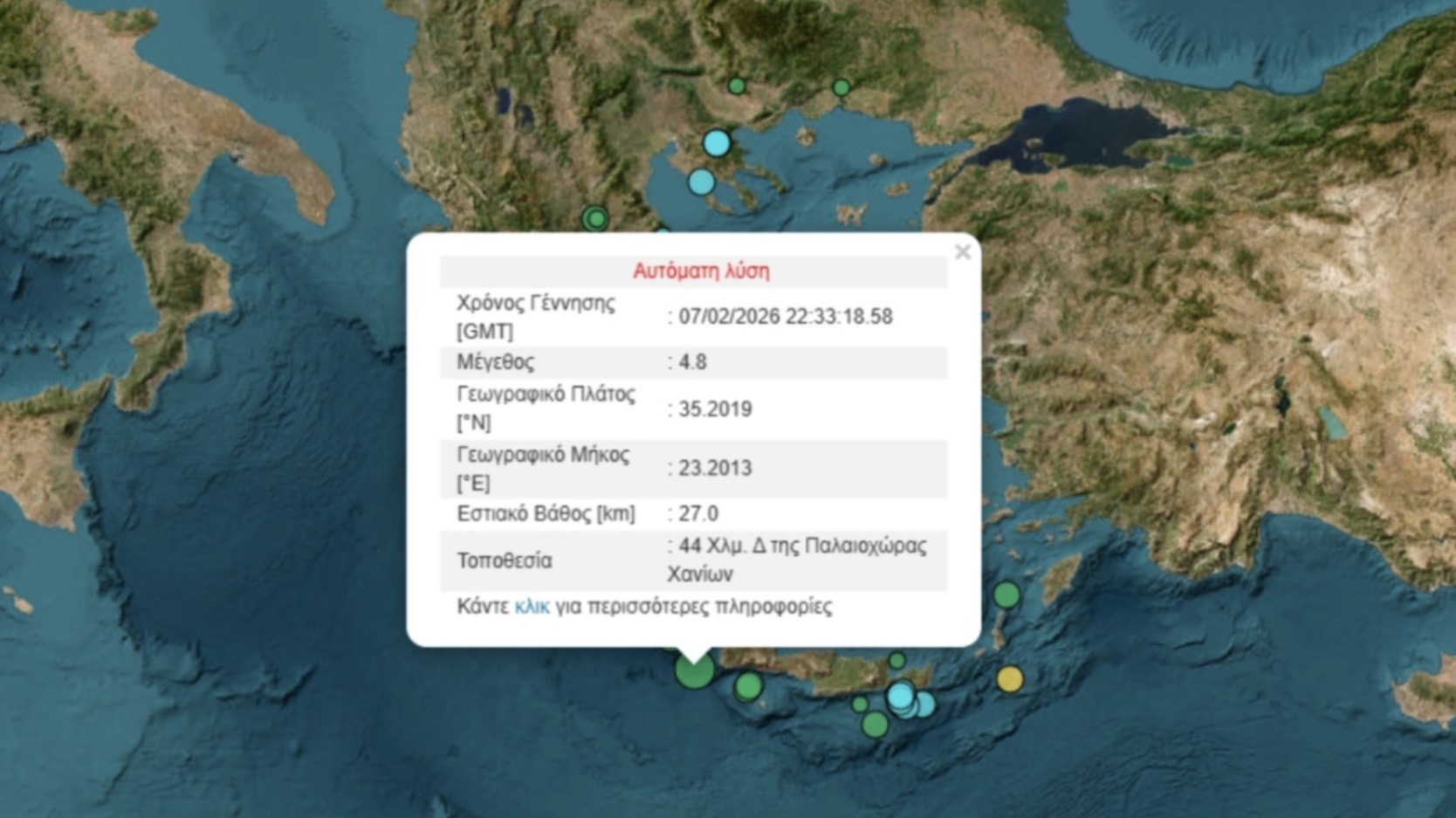 Σεισμική δόνηση μεγέθους 4,8 βαθμών της κλίμακας Ρίχτερ σημειώθηκε 33 λεπτά μετά τα μεσάνυχτα του Σαββάτου στα ανοιχτά της Κρήτης.