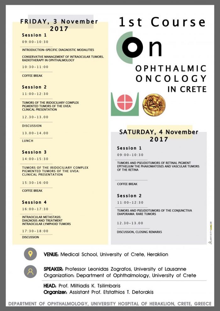 Στα πλαίσια της δραστηριότητας αυτής η Οφθαλμολογική Κλινική ΠΑΓΝΗ οργανώνει στο κτήριο της Ιατρικής Σχολής του Πανεπιστημίου Κρήτης διήμερο σεμινάριο οφθαλμικής ογκολογίας με προσκεκλημένο τον διακεκριμένο καθηγητή Οφθαλμολογίας του Πανεπιστημίου της Λωζάνης κ. Λεωνίδα Ζωγράφο, στις 3 & 4 Νοεμβρίου 2017.