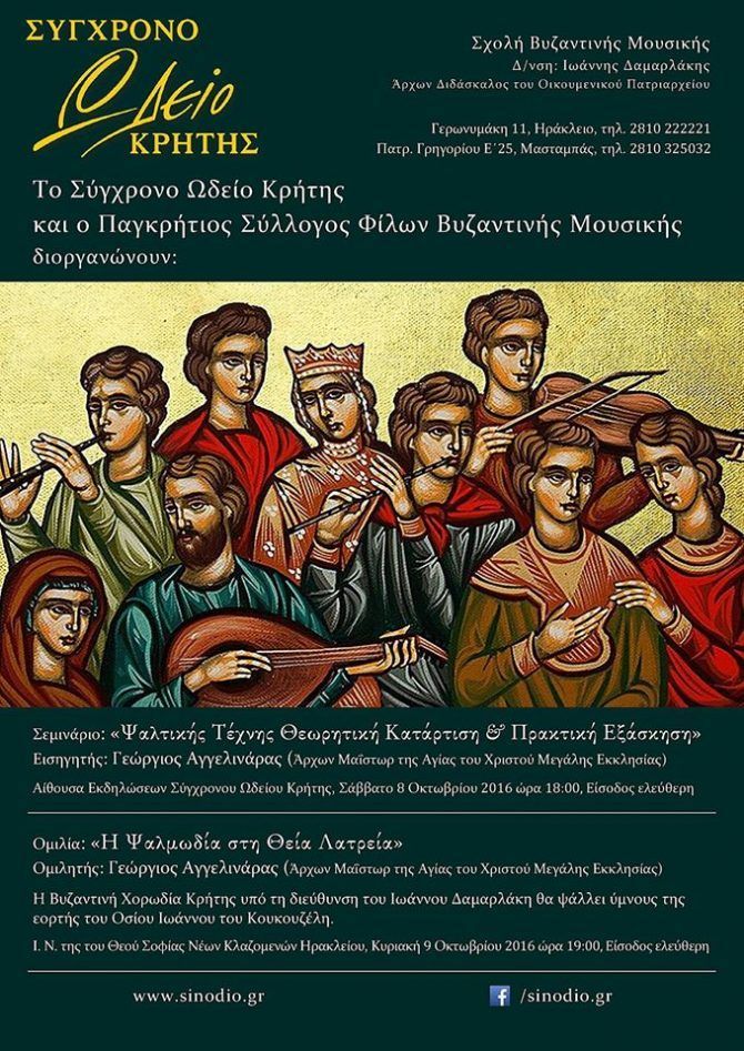 Η Σχολή Βυζαντινής Μουσικής του Σύγχρονου Ωδείου Κρήτης και ο Παγκρήτιος Σύλλογος Φίλων Βυζαντινής Μουσικής φιλοξενούν το Σαββατοκύριακο 8-9 Οκτωβρίου 2016 τον πρωτοψάλτη κ. Γεώργιο Αγγελινάρα (Άρχοντα Μαΐστωρα της Αγίας του Χριστού Μεγάλης Εκκλησίας) και διοργανώνουν δύο πολύ ενδιαφέρουσες εκδηλώσεις.