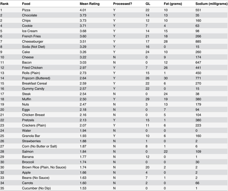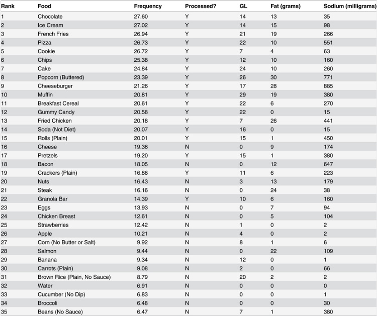 Οι ερευνητές διαπίστωσαν ότι τα φαγητά που ήταν πλούσια σε λίπος και είχαν μεγάλο γλυκαιμικό φορτίο ήταν εκείνα τα οποία οι φοιτητές θεωρούσαν πιθανότερο να είναι εθιστικά. Ειδικότερα, στην “κορυφή” βρέθηκε η σοκολάτα, ακολουθούμενη από το παγωτό και τις τηγανητές πατάτες.