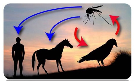 Μολυσμένα κουνούπια: Ο κύριος τρόπος μετάδοσης είναι μέσω τσιμπήματος μολυσμένου κουνουπιού (συνήθως το κοινό κουνούπι). Τα κουνούπια μολύνονται από άρρωστα πτηνά ή άλλα ζώα (π.χ. άλογα).