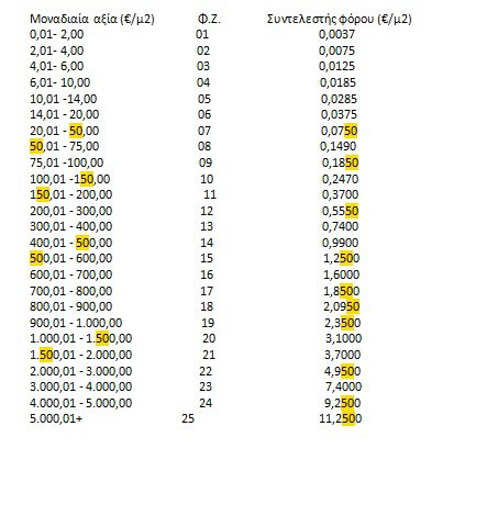 Το οικόπεδο εντάσσεται σε φορολογική ζώνη και προσδιορίζεται συντελεστής φόρου με βάση τη μοναδιαία αξία του οικοπέδου, σύμφωνα με τον πίνακα που ακολουθεί: